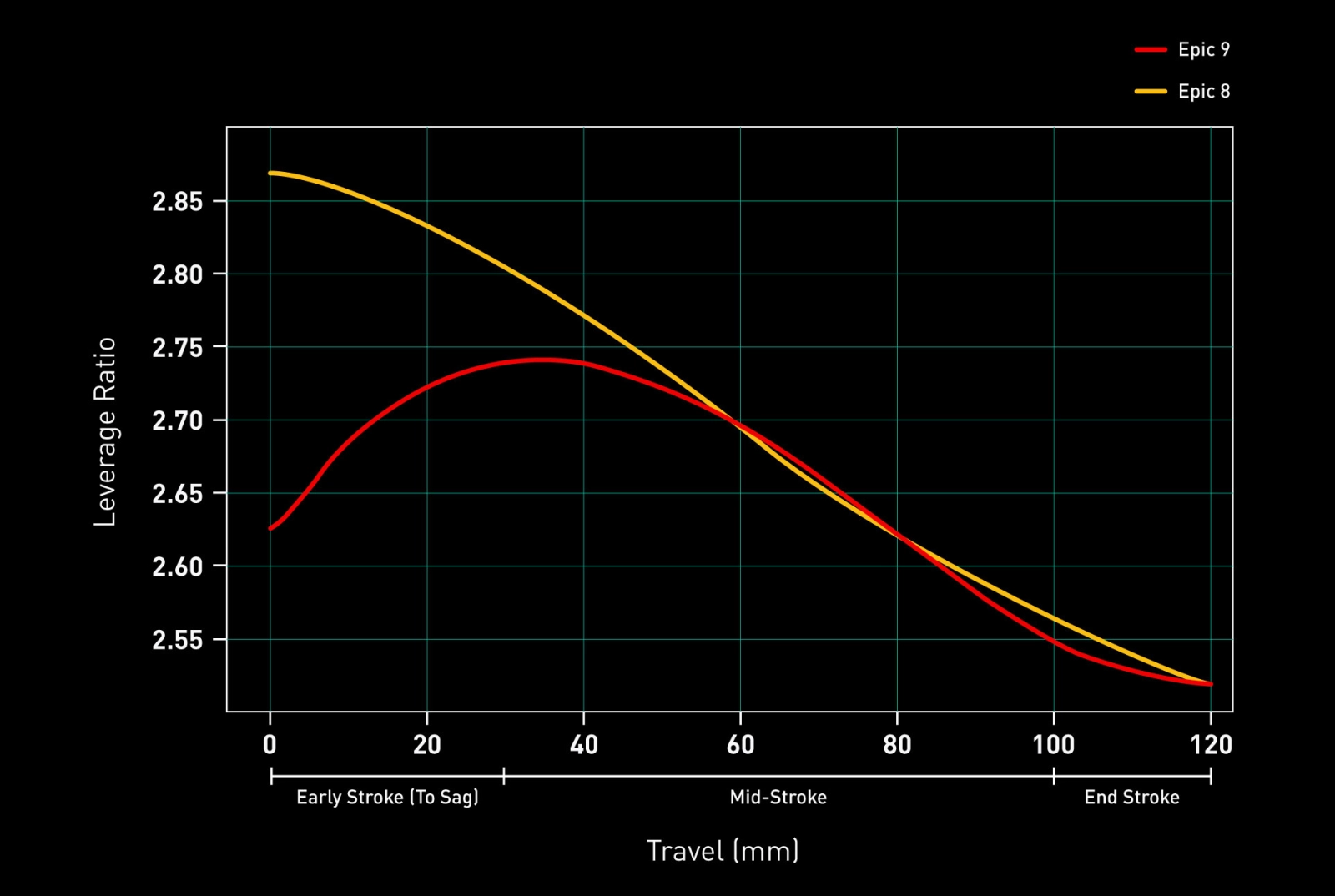 The new layout also has a significant impact on the suspension kinematic. A lower leverage rate around the sag point is said to provide a much firmer and more efficient pedalling platform. Beyond that point, the leverage curve behaves in a similar way to the Epic 8, promising similar control through the main bump-zone and ending stroke.